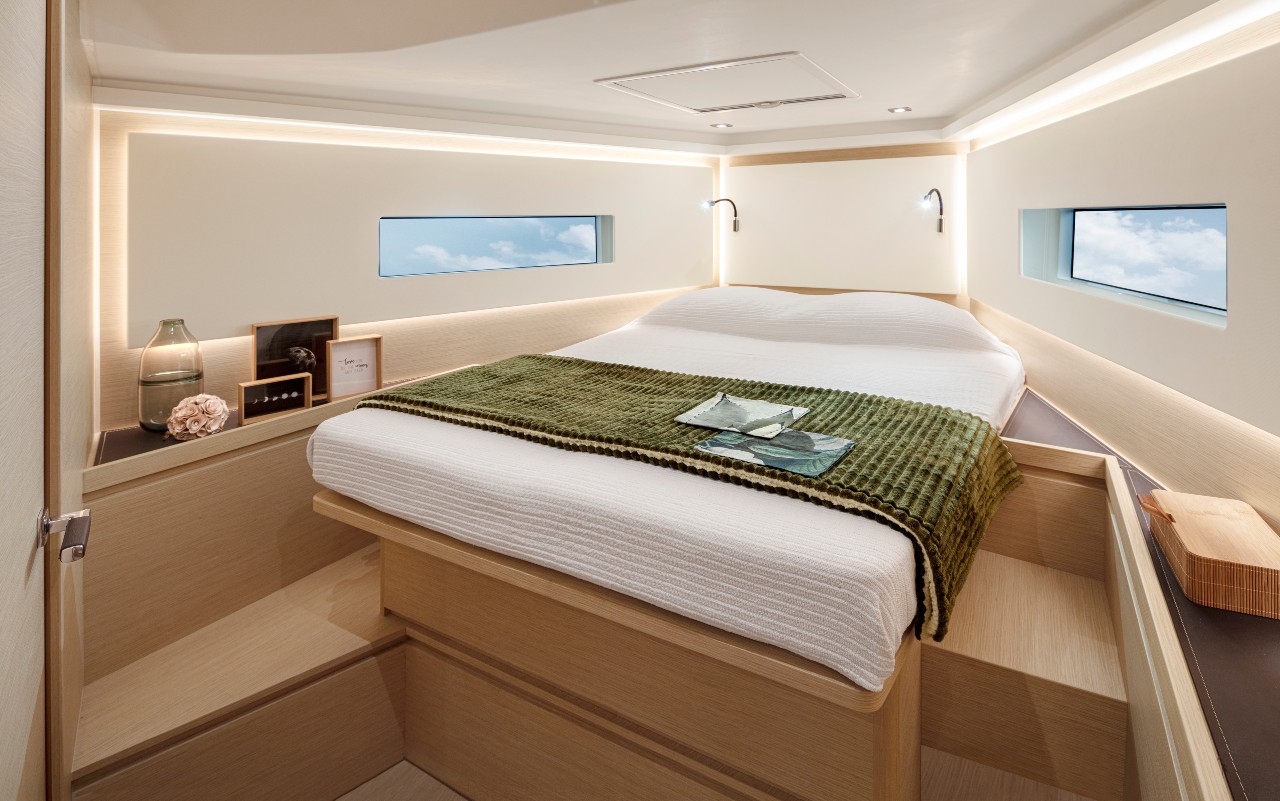 Hull chines extend all along to the bow offering form stability while sailing and plenty of interior volume with comfortably wide spaces.